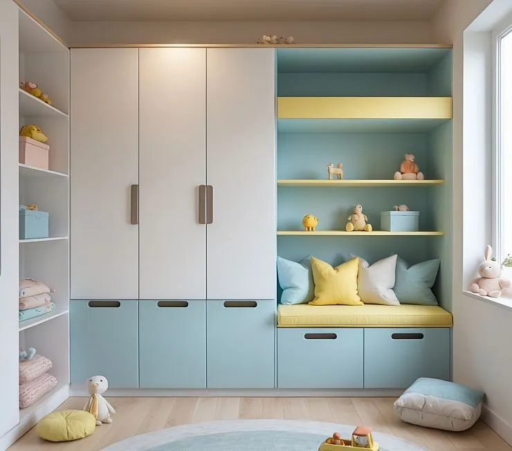 Современный встроенный шкаф для детской комнаты в ярких акцентных тонах — сочетание нежного голубого, белого и солнечно-жёлтого. Композиция включает вместительный шкаф для одежды, выдвижные ящики, открытые полки для игрушек и аксессуаров, а также мягкое сиденье у окна для отдыха и чтения.