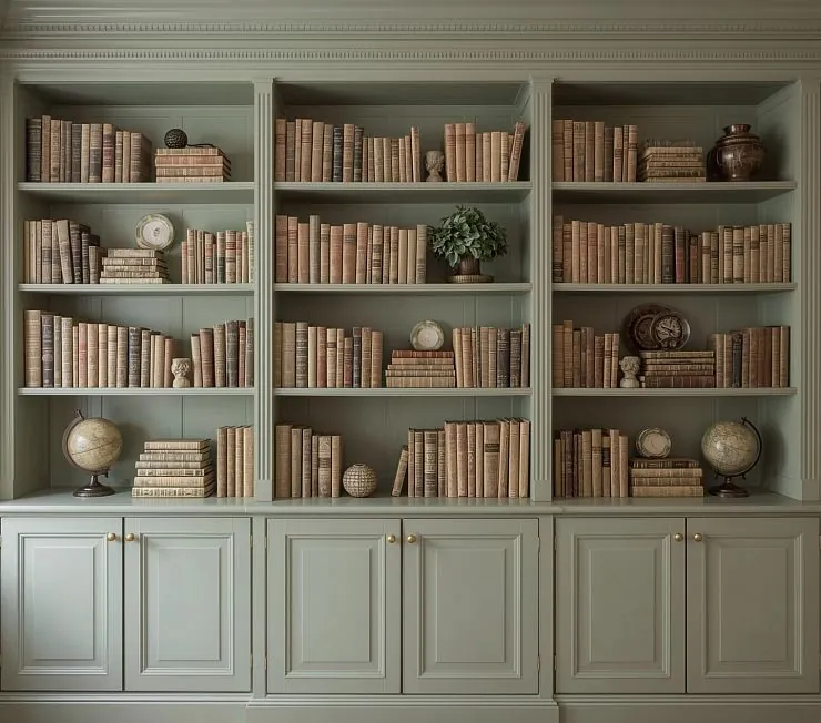 Встроенный шкаф в классическом английском стиле, выкрашен в пыльно-зелёный оттенок с матовой текстурой. Верхняя часть — открытые полки с декоративными пилястрами и книжной раскладкой. Нижние фасады — с фрезеровкой, классическими филёнками и аккуратными латунными ручками. Завершает композицию фигурный карниз с профилем. Изготовление возможно из массива или МДФ в эмали, под заказ.
