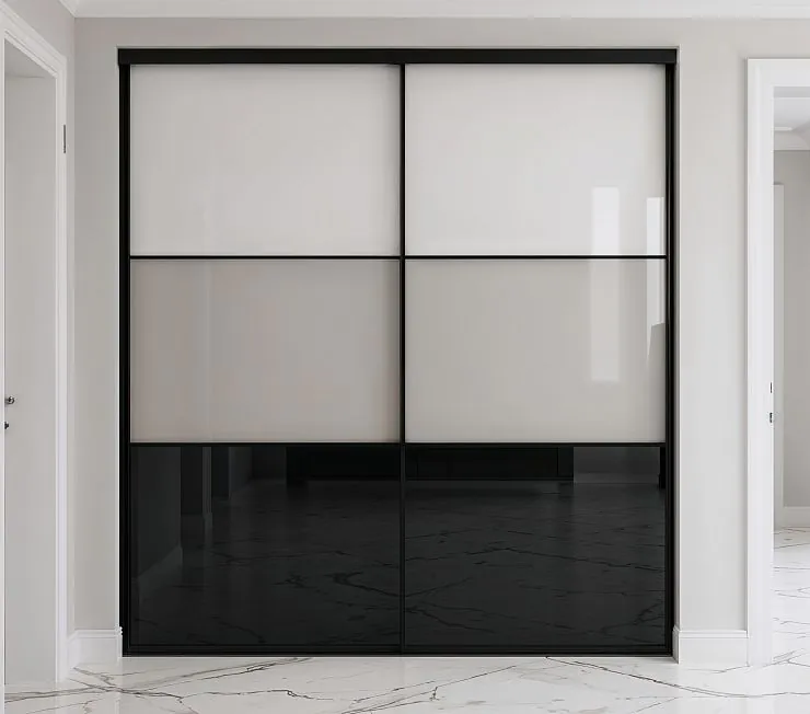 ECLIPSE — стильный двухдверный шкаф-купе в ультрасовременном дизайне. Контраст чёрного, серого и белого стекла создаёт строгий, элегантный образ, идеально подходящий для интерьеров в стиле хай-тек, минимализм или современная классика.