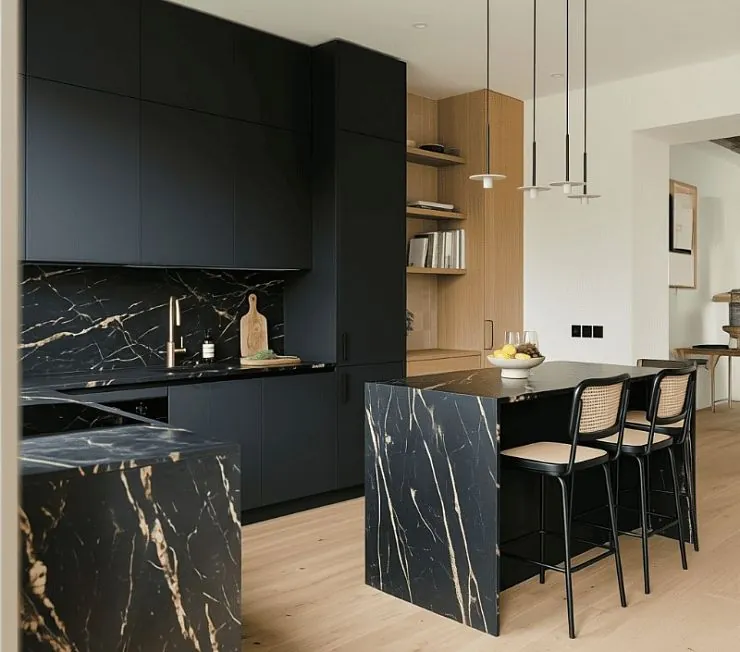 Фасады выполнены из матового окрашенного МДФ в благородном чёрном оттенке (RAL 9005), что придаёт кухне особую глубину и эксклюзивность. Главным акцентом интерьера служит столешница и фартук из искусственного камня под мрамор Nero Marquina с выразительными золотисто-бежевыми прожилками. Этот материал не только выглядит эффектно, но и отличается высокой износостойкостью и долговечностью, идеально подходя для активной кухни.