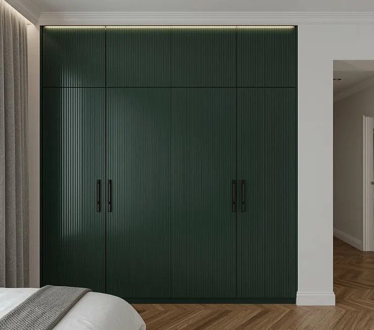 Современный встроенный шкаф с фасадами из МДФ в благородном оттенке «тёмный лес». Вертикальная фрезеровка придаёт фактурность и глубину, а скрытая верхняя подсветка создаёт мягкое рассеянное освещение и подчёркивает геометрию фасадов. Идеальное решение для спальни в современном, минималистичном или скандинавском стиле.