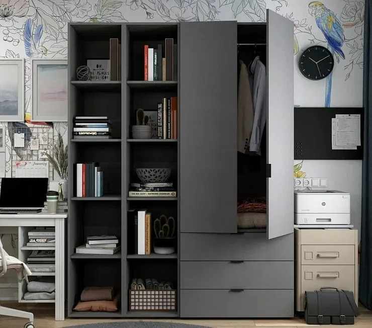 Строгая геометрия, лаконичная цветовая гамма, тщательно продуманное расположение шкафов, полок и секций. Внутренняя зона шкафа для одежды оборудовано штангой, дополнительно предусмотрены 3 выдвижных ящика. Слева - двухрядная колонна с полками, в которых удобно расположить личные вещи, гаджеты, книги, аксессуары. Шкаф выполнен из МДФ в пленке ПВХ. Шкаф производится по размерам, потребуется выезд замерщика.