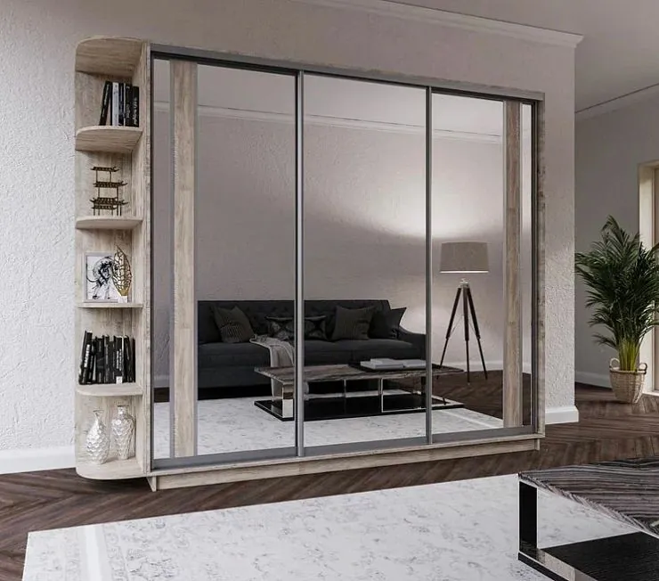 Система хранения с зеркальными фасадами “под потолок” включает в себя три секции со штангами, нишами для обуви и выдвижными ящиками. Дополнительно по краям основного коруса расположены открытые полки для хранения аксессуаров. Корпус изготовлен из ЛДСП в пленке “беленый дуб”. Cистема купе на алюминиевой раме, внутренняя ящичная фурнитура - “Blum” (Австрия). Выпускается под заказ, понадобится выезд нашего замерщика.