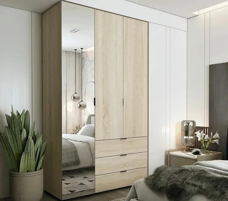 Узкий трёх створчатый распашной шкаф с наружными выдвижными ящиками. На полно размерной створке зеркало от пола до самой высоты. Фасад МДФ в шпоне, можно выполнить из натурального дерева. Ольха, берёза, бук. Шкаф можно поставить в прихожую, спальню или детскую. Внутренне наполнение оптимизировать по назначения под заказ. Размеры можно заказать свои.