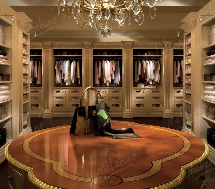 Вместительная система хранения с множеством полок, ящиков и отсеков со штангами, верхняя часть которого украшена резными элементами