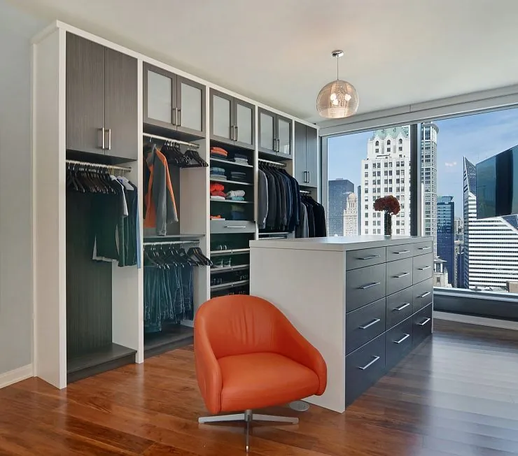 Современный вариант с антресолями. Стильный и практичный, изготовлен из высококачественной древесно-волокнистой плиты с использованием австрийской премиум-фурнитуры Blum и Hettich. Центральные антресоли декорированы матовым стеклом. Оснащен разноуровневыми штангами для верхней одежды, комбинированной секцией для белья и обуви. В исполнении корпуса «под потолок» обладает максимальной вместительностью. Изготавливается по нужным размерам, в зависимости от характеристик комнаты.
