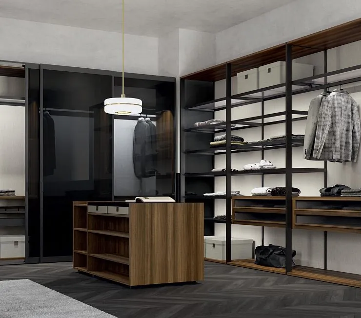 Лаконичный вариант для мужского гардероба и оптимальный выбор для тех, кто предпочитает интерьеры в стиле лофт. Металлокаркас оставляет много пространства, а тонированное закаленное стекло корпуса создает атмосферу минимализма. Компактная модель выполнена в угловом варианте, оснащена раздвижными дверями, антресольной зоной. Имеется отдельный остров с полками из древесно-волокнистой плиты и с небольшим стеклянным боксом для ценных аксессуаров. Изготавливается в различной высоте, ширине и глубине.