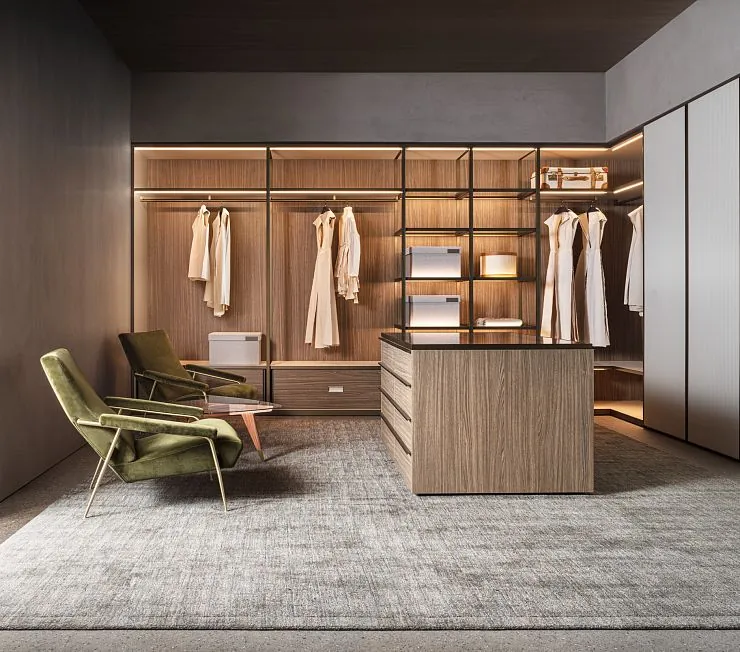 Стильное и практичное решение для гардероба с продуманным наполнением, рельсовой системой и светильниками. При возможности дополняется небольшой внешней тумбой. Корпус - ламинированная древесно-стружечная плита "Egger" или натуральное дерево, что влияет на стоимость. Расположение и величина секций - по предпочтениям покупателя.