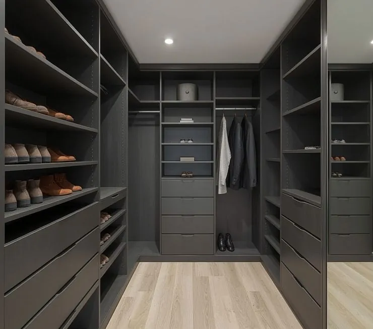 П-образная гардеробная из матового тёмно-графитового ЛДСП, оснащённая просторными секциями для одежды, большим количеством полок для обуви, выдвижными ящиками и зеркалом в полный рост. Компоновка продумана для максимальной организации и удобства.