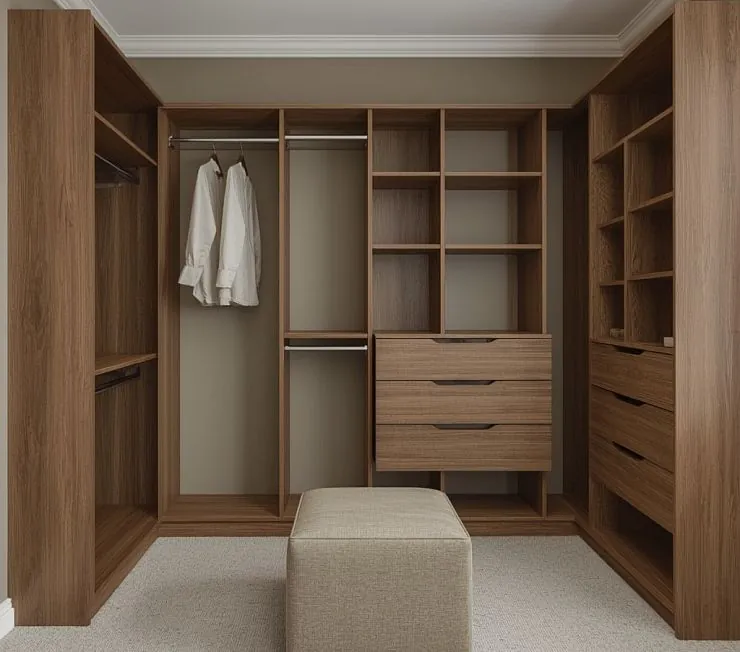 Открытая угловая гардеробная из ламинированного МДФ с текстурой ореха. Оснащена штангами для одежды, выдвижными ящиками и множеством полок для удобной организации хранения. Отлично впишется в просторную спальню или отдельную гардеробную комнату.