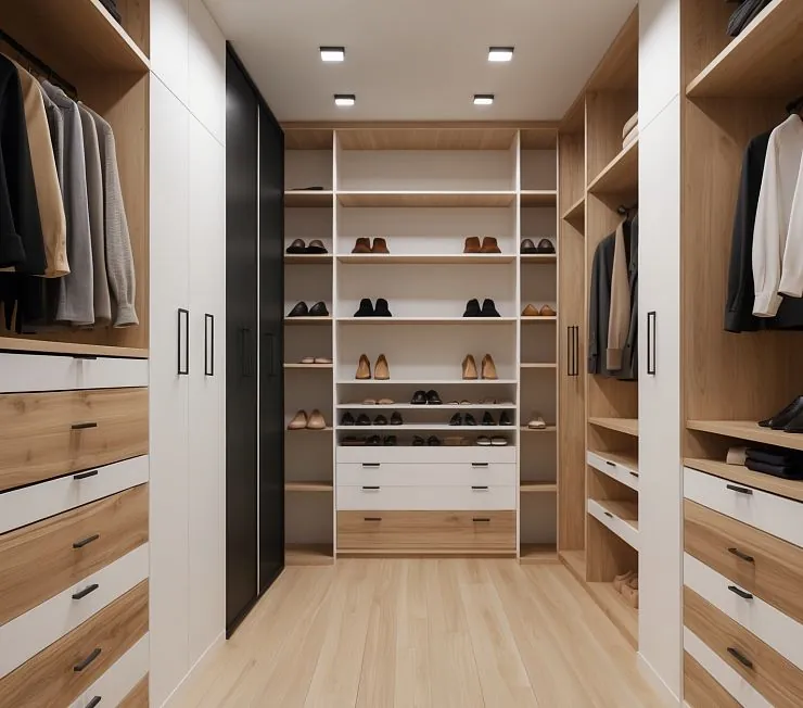Просторная гардеробная с ярко выраженной зоной хранения обуви. Чистые линии, сочетание белого, древесного декора и черной фурнитуры придают пространству скандинавскую эстетику. Открытые и закрытые секции обеспечивают функциональность, а черные раздвижные двери добавляют акцент и глубину. Идеальное решение для упорядоченного хранения одежды и обуви в современном интерьере.