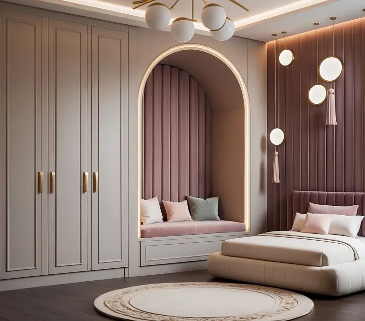 Элегантный детский гарнитур в мягкой бежево-розовой гамме. Встроенный шкаф с золотыми ручками гармонично сочетается с арочной нишей, оформленной мягкими панелями и подсветкой, где можно устроить уютное место для чтения или отдыха. Композицию дополняет мягкая кровать с обивкой и современное освещение. Идеальное решение для стильной и функциональной детской комнаты.