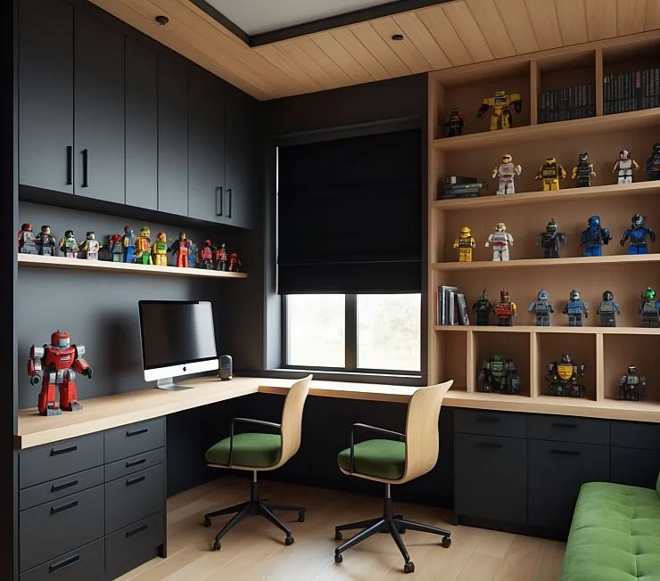 Функциональный подростковый гарнитур с двойной рабочей зоной. Выполнен в стильном сочетании матового чёрного и натурального дерева. Широкая столешница с двумя местами идеально подходит для учёбы, совместных занятий или хобби. Открытые стеллажи отлично подходят для коллекций, книг и аксессуаров, а верхние шкафы обеспечивают скрытое хранение.