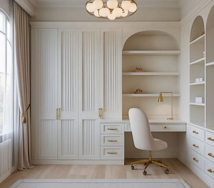 Изящный встроенный гарнитур в светлых тонах с декоративными фрезерованными фасадами. Сочетает в себе просторный шкаф для одежды, открытую систему стеллажей и удобное рабочее место с письменным столом и выдвижными ящиками. Золотая фурнитура придаёт мебели утончённость, а мягкое цветовое решение создаёт атмосферу лёгкости и гармонии.