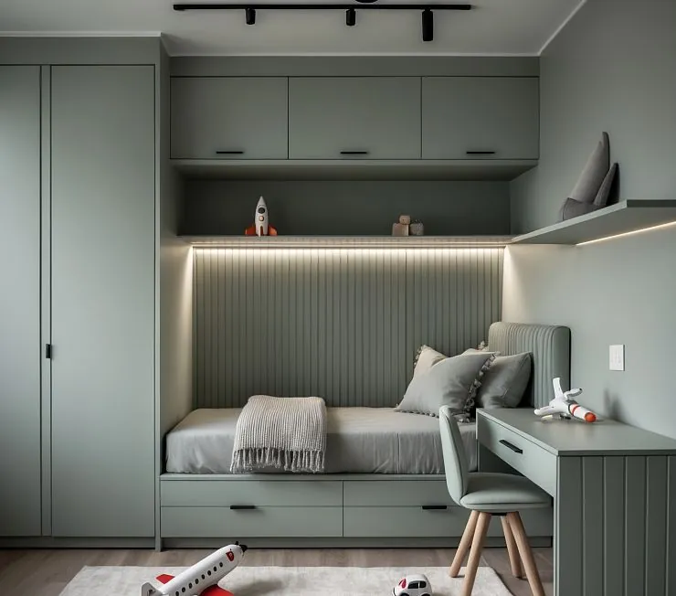 Стильный детский гарнитур в современном минималистичном стиле, выполненный в мягком серо-зеленом оттенке. Встроенное решение сочетает кровать с ящиками для хранения, шкаф, навесные модули и компактный письменный стол. Вертикальная панель за спинкой кровати с LED-подсветкой создает атмосферу уюта и современности.