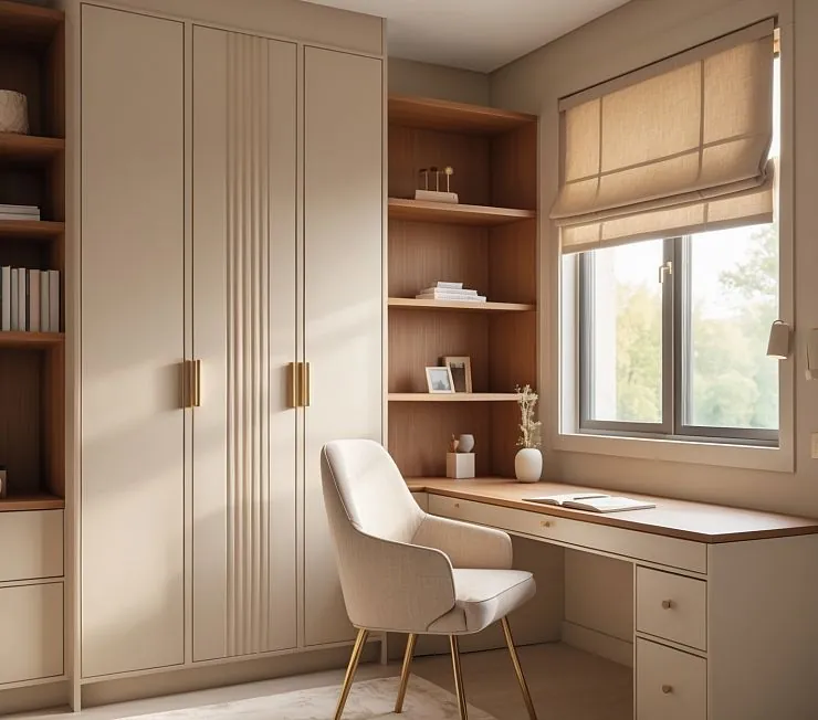 Элегантный встроенный комплект в кремово-древесных оттенках с вертикальными декоративными линиями на фасадах. Шкафы с золотистыми ручками создают изысканный акцент, а открытые полки придают интерьеру лёгкость. Просторный рабочий стол у окна обеспечивает комфортное место для учёбы или работы. Гарнитур идеально подходит для спальни или кабинета, объединяя эстетику и функциональность.
