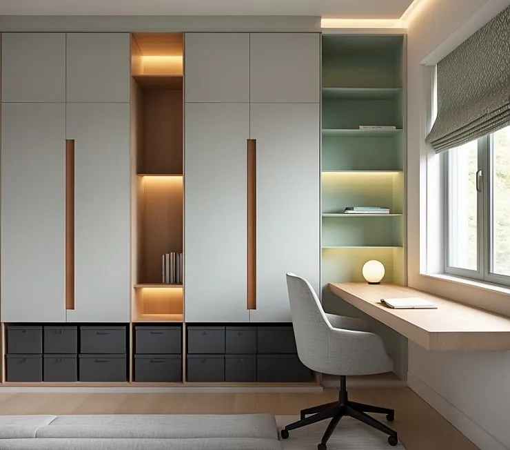 Современный встроенный гарнитур с идеальным балансом строгих линий и уютных акцентов. Комбинация закрытых шкафов, открытых ниш с подсветкой и зелёных стеллажей создаёт стильный ритм интерьера. Встроенное рабочее место у окна обеспечивает комфорт и функциональность, а нижние ящики в тёмном тоне добавляют практичности и контраста.