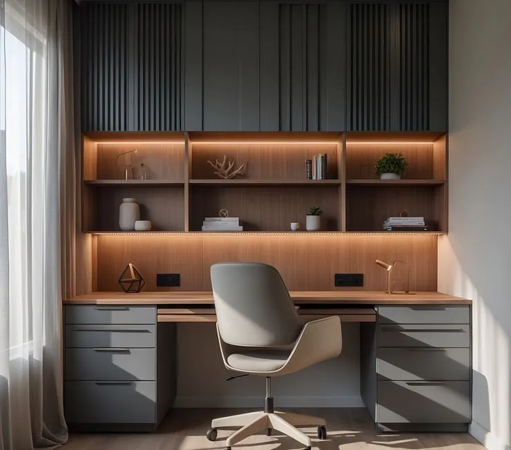 Современный встроенный кабинет в тёмно-графитовом цвете с акцентной отделкой из натурального дерева. Рабочая зона дополнена тёплой подсветкой, создающей уют и комфорт для продуктивной работы. Большие шкафы сверху и вместительные тумбы снизу обеспечивают идеальную систему хранения, а стильные вертикальные панели добавляют интерьеру строгую элегантность.
