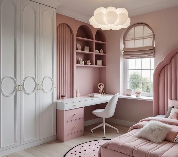 Нежный и изысканный гарнитур для девичьей комнаты, выполненный в мягких пастельно-розовых тонах с белыми акцентами. Декоративные фасады с изящными круглыми элементами придают мебели особое очарование. Удобный встроенный письменный стол с ящиками и открытые ниши для книг и аксессуаров создают уютное и практичное пространство. Мягкое изголовье кровати с арочной формой и пушистый текстиль завершают атмосферу уюта и тепла.