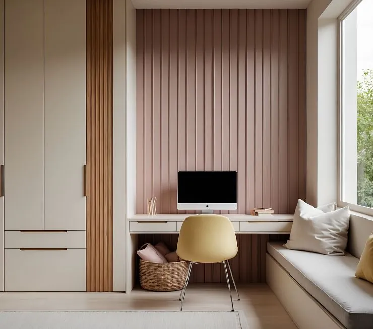 Лёгкий и уютный встроенный гарнитур, созданный специально для детской или подростковой комнаты. Нежные бежевые фасады в сочетании с акцентной розовой стеной создают тёплую атмосферу. Встроенное рабочее место с письменным столом у окна дополняется удобной зоной для отдыха с мягкой скамьёй и подушками. Шкаф с вертикальными деревянными вставками добавляет изысканности и уюта.