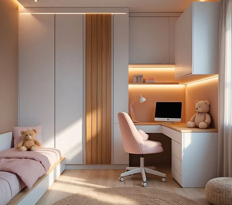Светлый и уютный детский гарнитур в скандинавском стиле. Сочетание белых фасадов и вставок из натурального дерева создаёт тёплую и гармоничную атмосферу. Встроенный шкаф, кровать и рабочая зона с полками и подсветкой обеспечивают максимум функциональности на небольшом пространстве. Мягкий стул и акценты в пастельных тонах делают интерьер ещё более комфортным для ребёнка.