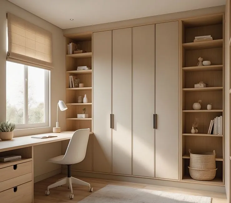 Уютный и светлый гарнитур в скандинавском стиле, идеально подходящий для детской или подростковой комнаты. Светлые фасады в сочетании с текстурой натурального дерева создают атмосферу тепла и уюта. Просторный встроенный шкаф с закрытыми дверцами дополняется открытыми стеллажами для книг и декора. Рабочая зона у окна обеспечивает хорошее естественное освещение, а широкая столешница и удобное кресло делают пространство функциональным и комфортным.