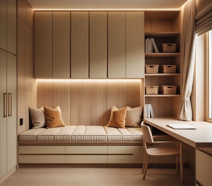 Функциональный и стильный комплект мебели в скандинавском стиле с элементами минимализма. Выполнен из светлого шпона и матовых фасадов в тёплом бежевом оттенке. Гарнитур сочетает вместительные шкафы, полки для хранения, удобное рабочее место у окна и уютную зону отдыха с мягкими подушками. Встроенная подсветка подчёркивает современный дизайн и создаёт атмосферу уюта.