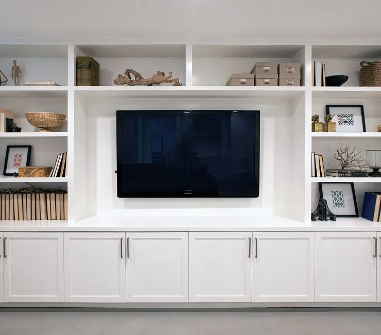 Стенка в гостиную на всю стену. Крупные открытые полки позволяют разместить множество предметов декора или книг. Самая большая полка - ниша для телевизора. Нижняя часть стенки выступает вперёд и закрыта распашным дверями. Чёрные ручки и телевизор на фоне белой мебели, при заказе мебели цвета подбираются под ваш интерьер. Двери и корпус встроенного шкафа изготавливают из МДФ в эмали, возможно изготовление из массива.
