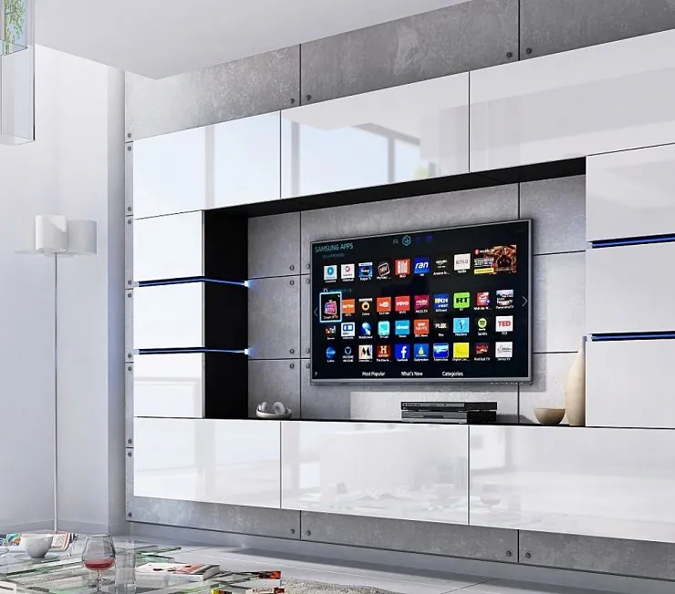 Мебель сочетает черты современного времени и классики: традиционное черно-белое исполнение, минималистический дизайн с диджитал концепцией. Подвесные тумбы и антресоли совместно с подвесным шкафами формируют нишу для современного цифрового телевизора. Дополняют интерьер стеновые панели органично сочетающиеся с мебельным гарнитуром. Материал фасадов МДФ в эмали с глянцем. Мебель изготавливается на заказ по индивидуальным размерам. Цвет мебели корректируется по дизайну помещения при оформлении заказа.