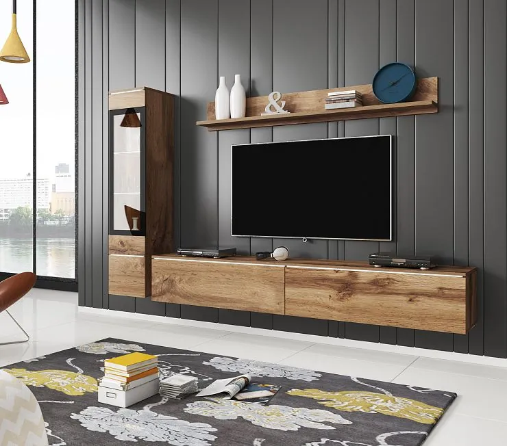 Модель с навесным шкафчиком, тумбой и полкой, которые можно использовать для хранения книг, посуды, семейных фото и других вещей