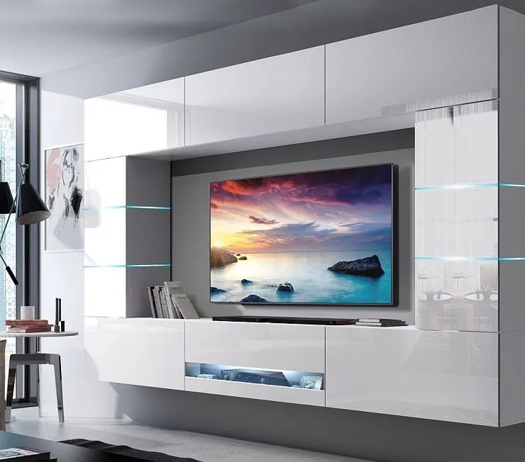 Комплект подвесной мебели в гостиную. Телевизор и вся мебель монтируются на стену и органично сочетаются. Нишу формируют подвесные антресоли и подвесные тумбы, по бокам подвесные шкафы. Фасады выполнены из МДФ в эмали с глянцем. Цвет подбирается по интерьеру. Мебель заказывают по индивидуальным размерам.