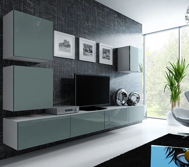 Комплект модульной мебели в гостиную. Состоит только из подвесных тумб, антресолей и шкафчиков. Глянцевые фасады распашные. Тумбы под домашнюю аудио и видео технику, под телевизор. Роскошная мебель вариант по цене производителя. Заказать можно по размерам вашего зала и в цветах дизайна интерьера.
