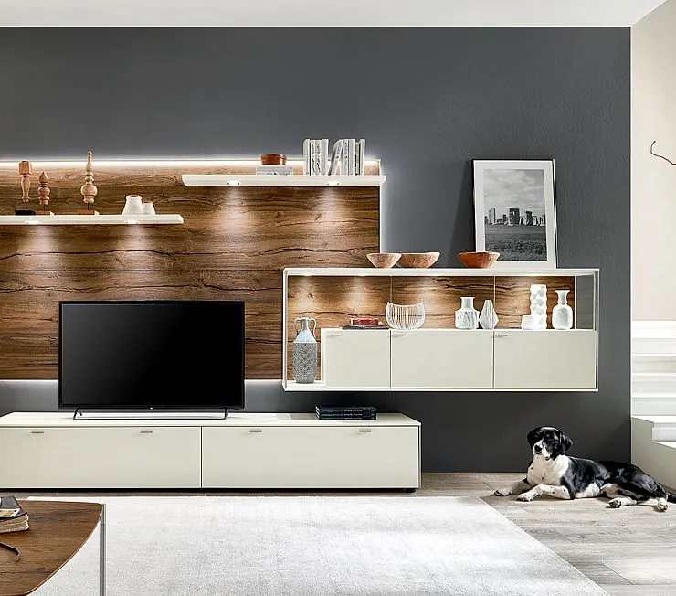 Комплект корпусной мебели для гостиной изготавливается по индивидуальным размерам комнаты под заказ по ценам фабрики. Набор мебели представляет собой дерзкое сочетание темного натурального дерева и светлых матовых поверхностей.