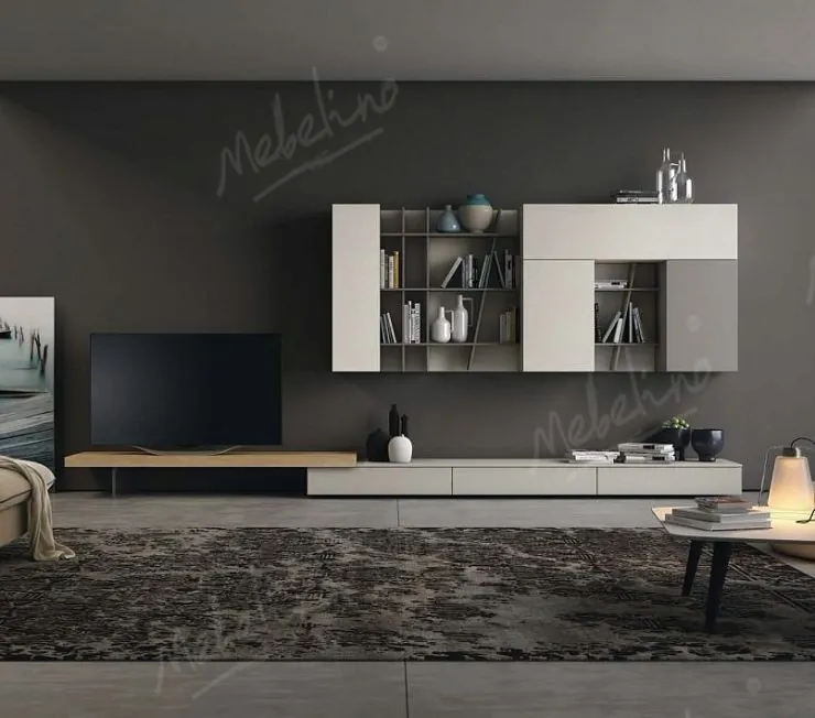 Бежевая с открытыми полками. Набор в квартире состоит из двух «уровней»: первый включает низкую тумбу и длинный «стол» для ТВ, второй – шкафчики и полки