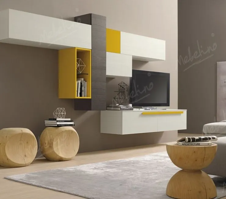 Комплект мебели собран из навесной тумбы, распашных шкафчиков, открытой полки для размещения книг и элементов декора