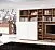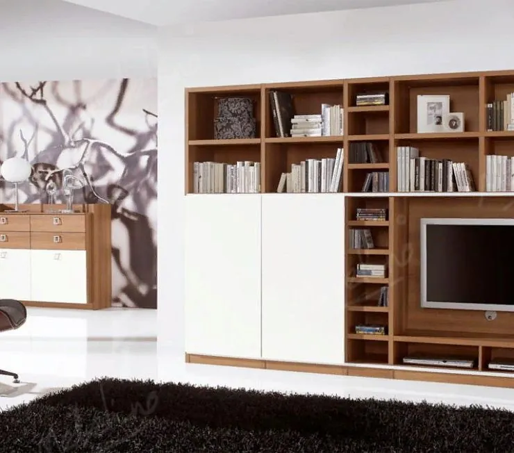 Невысокая мебель, включающая большое количество открытых полок, распашной шкафчик и место для телевизора