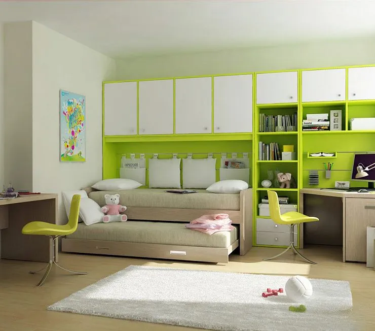 Не только впечатляет своим удобством, но и заряжает отличным настроением! Сочный салатовый с белым – яркий, эксклюзивный дизайн, от которого дети будут в восторге. 4 больших и 3 антресольных шкафчика, 2 спальных места, стеллаж и 2 учебные зоны со столами - этак компактная детская по своей функциональности превосходит все ожидания. Материал - МДФ в пленке ПВХ с исключительной прочностью и насыщенным цветом. Только позаказное производство по замерам помещения.