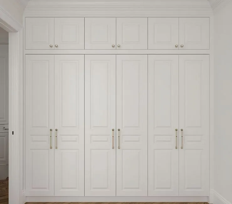 Встроенный распашной шкаф, выполненный в классическом стиле, окрашен в белый цвет и полностью интегрирован в нишу. Фасады украшены симметричной фрезеровкой и дополнены латунными ручками. Верхняя часть включает антресольные модули с отдельными дверцами и круглыми ручками. Паркет в ёлочку и белая лепнина на потолке подчёркивают сдержанную элегантность интерьера.