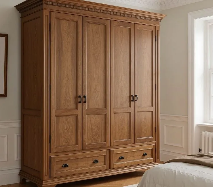 Элегантный четырёхстворчатый шкаф в классическом стиле, выполненный из МДФ с отделкой шпоном тёмного ореха. Фасады украшены филёнчатыми вставками и аккуратной фрезеровкой. Внизу расположены два вместительных выдвижных ящика с металлическими ручками-раковинами, а двери оснащены петлями плавного закрывания. Такой шкаф отлично подойдёт для спальни или гостиной в классическом и неоклассическом интерьере.