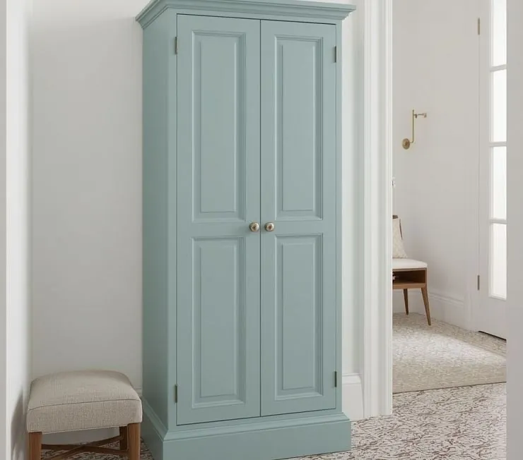 Изящный напольный шкаф для обуви с выразительным карнизом и утопленными филёнками на фасадах. Выполнен в нежном пудрово-голубом цвете, он гармонично впишется в классический или прованский интерьер прихожей. Использование эмали NCS в сочетании с плотной МДФ Egger обеспечивает стойкость покрытия и безупречную геометрию форм.