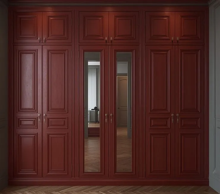 Роскошный гардероб с шестью створками в классическом стиле, выполненный в насыщенном бордовом оттенке. Центральные фасады оснащены зеркальными панелями, визуально расширяющими пространство. Декоративная фрезеровка на дверях подчеркивает элегантность и премиальность мебели. Идеально впишется в спальню или гардеробную зону.