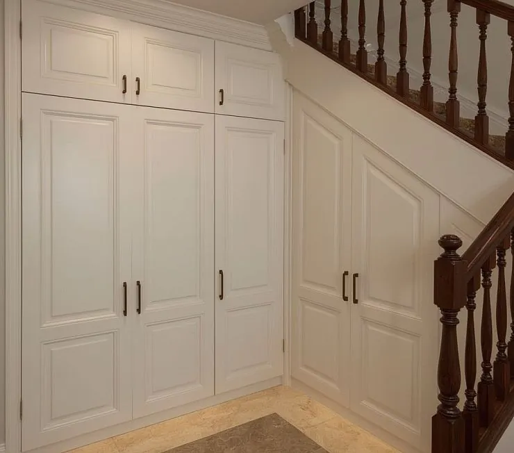 Элегантный шкаф, встроенный под лестницей, выполненный в классическом стиле с декоративными филёнчатыми фасадами и изысканным молдингом. Мягкий кремовый оттенок гармонично сочетается с тёплой отделкой лестницы из тёмного дерева. Вместительная конструкция с несколькими секциями и дополнительными верхними модулями обеспечивает оптимальное хранение одежды, обуви и аксессуаров.