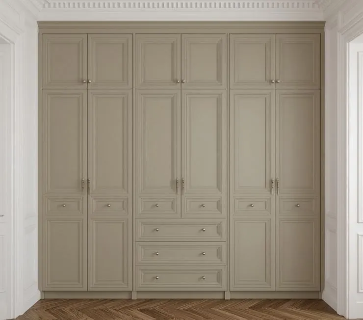 Модель встроенного шкафа в нише в классическом стиле: шесть створок с объёмными филёнками, над ними — антресольные модули. Центральная секция дополнена четырьмя выдвижными ящиками. Отделка — матовая, в тёплом светло-бежевом тоне. Фурнитура — лаконичные металлические ручки в тон. Верх шкафа завершён декоративным карнизом.