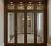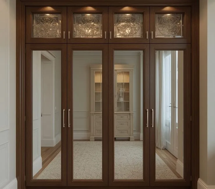 Роскошный встроенный шкаф в корпусе из тёмного дерева с четырьмя распашными зеркальными дверями во всю высоту. Верхняя часть оформлена декоративными антресолями с витражными вставками и встроенной подсветкой, придающей изысканность. Зеркальные фасады визуально расширяют пространство и делают его светлее. Отлично подойдёт для интерьеров в классическом и неоклассическом стиле.