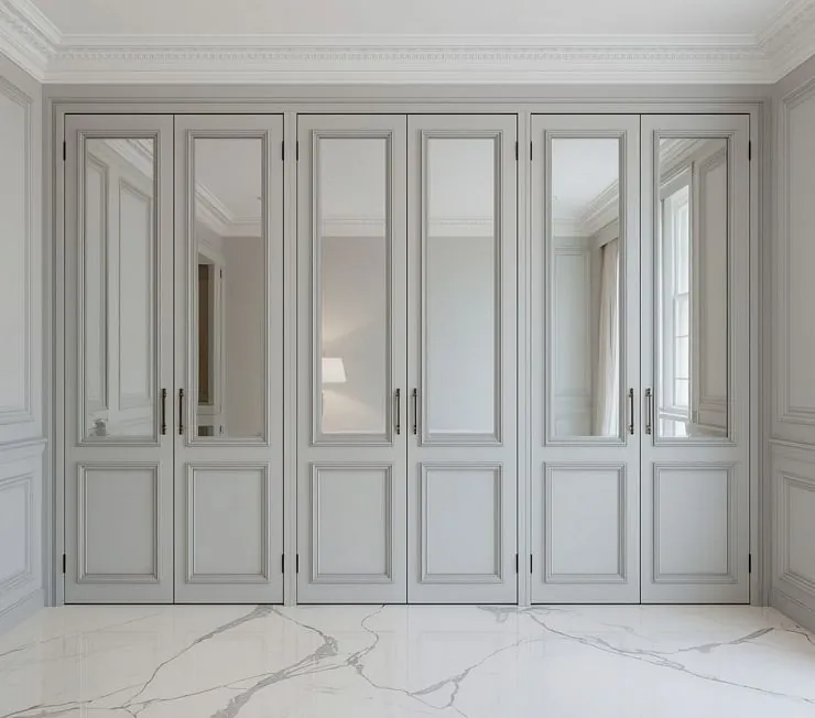 Роскошный встроенный шкаф с распашными дверьми, выполненный в изысканном классическом стиле. Декоративные филёнки и зеркальные вставки на фасадах не только визуально расширяют пространство, но и добавляют утончённости. Нейтральный серый оттенок гармонирует с лепниной и мраморным полом, идеально вписываясь в классические и неоклассические интерьеры. Изготавливается под заказ с возможностью выбора наполнения и отделки.
