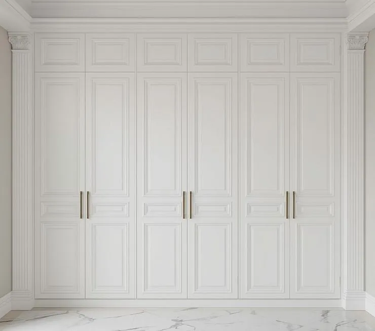 Напольный встроенный шкаф с шестью высокими распашными дверями и антресольной зоной. Выполнен в классическом стиле: фасады декорированы объёмными филёнками, верх оформлен карнизом с деталями лепнины. Цвет — матовый белый, ручки — вытянутые, латунного цвета. На полу — глянцевая плитка под белый мрамор.