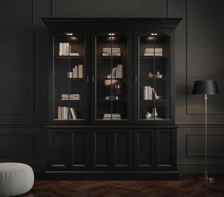 Эффектный отдельно стоящий книжный шкаф в глубоких чёрных тонах. Верхняя часть оснащена прозрачными стеклянными дверцами с изящными арочными рамками и встроенной точечной подсветкой, что красиво выделяет книги и декоративные предметы. Нижняя часть закрыта глухими фасадами для аккуратного хранения. Идеален для современных и классических интерьеров.