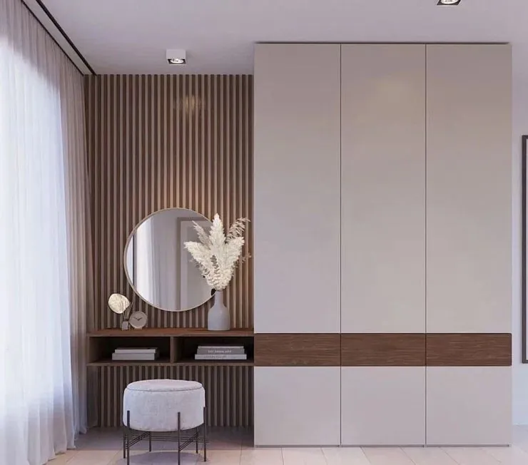 Сочетание закрытой системы хранения и секции с полками в оригинальной комбинации матовой эмали и текстуры натурального дерева. Трехстворчатый шкаф имеет продуманное функциональное наполнение, включающее зону для одежды, нижние ниши для обуви, антресоли и несколько ящиков. Подвесной столик можно использовать под ТВ. Материал фасадов - МДФ, покрытый эмалью. Производится только в индивидуальных размерах.