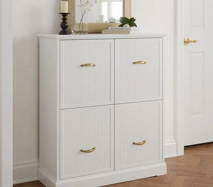 Элегантный напольный обувной шкаф, оформленный в светлой матовой эмали с изысканными рифлёными фасадами. Четыре откидные створки с роскошными изогнутыми ручками в золотом оттенке придают модели классическую утонченность. Идеально подходит для прихожих в стиле неоклассика, прованс или современная классика.