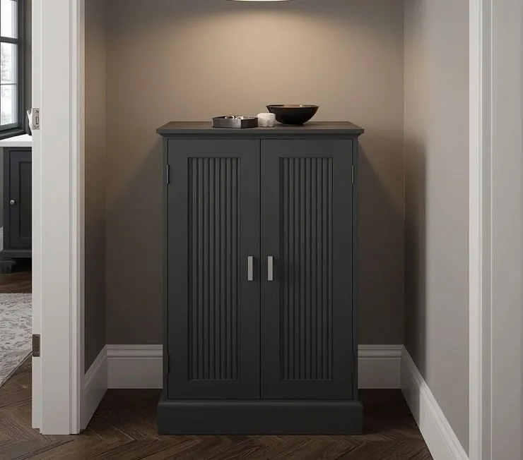 Элегантный и практичный обувной шкаф в насыщенном графитовом цвете с вертикальной фрезеровкой на фасадах. Его лаконичный дизайн идеально подходит для узких пространств или ниш в прихожей. Металлические ручки и цокольное основание подчеркивают геометрию и добавляют шкафу устойчивость. Стильное решение для интерьера в духе современного минимализма.